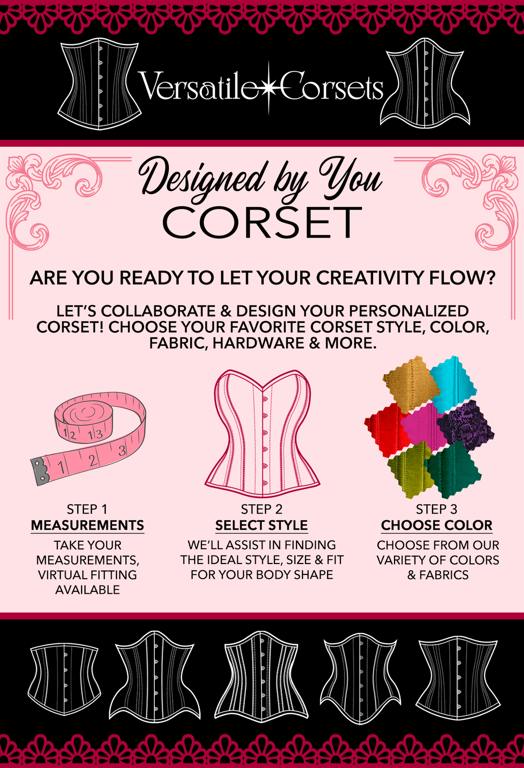 Choose your favorite corset style, waist size, fabric options, and closure option.
